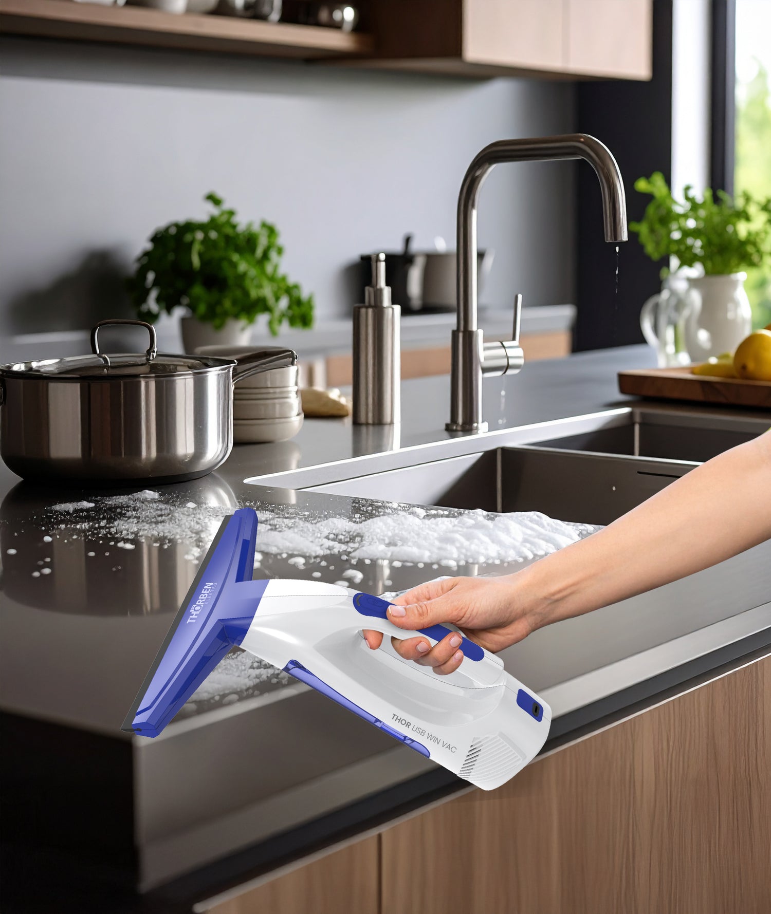 Presentamos la nueva Thor Usb Win Vac, la aspiradora inalámbrica especialmente diseñada para limpiar vidrios, espejos, cerámica y superficies lisas de forma rápida, eficiente y sin dejar residuos. Su batería de litio de 2200 mAh permite hasta 40 minutos de autonomía, con carga USB‑C en aproximadamente 3 horas. Posee una succión potente (~1,2 kPa) y un depósito de agua sucia de 20 ml: aspira el agua, deja la superficie seca, y gracias a su escurridor de goma suave elimina manchas sin dejar huellas. Su diseño liviano (700 gr) facilita el uso en el hogar o la oficina, incluso en ventanas de altura, balcones o mamparas. Incluye accesorios prácticos: botella rociadora, paño de microfibra lavable y cargador USB, por lo que viene listo para usar. Ideal para quienes buscan que sus cristales, vitrinas o mamparas brillen sin esfuerzo, en tres simples pasos: rocía – limpia – aspira.